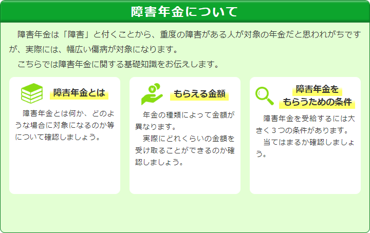 障害年金とは何かといった基本的な情報や、もらえる金額、もらうための条件について掲載しています。障害年金について知りたい方は、こちらをご覧ください。