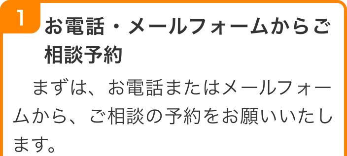 私たちへご相談いただく際の流れについてご紹介しています。ご相談をご希望の方は、まずはフリーダイヤル・メールフォームからお問い合わせください。
