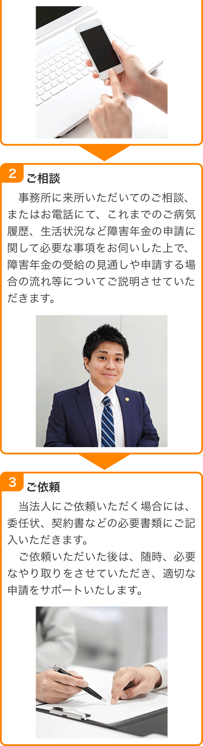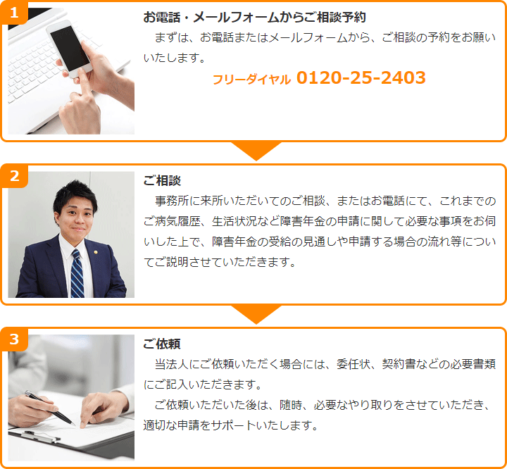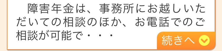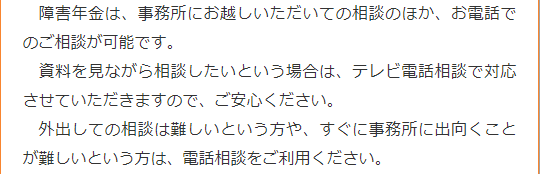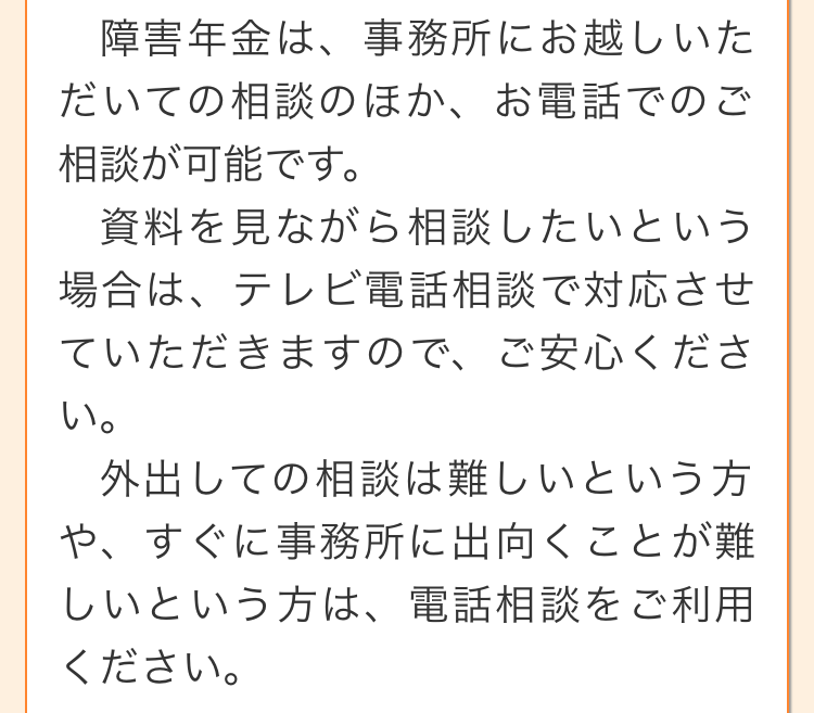 障害年金のご相談はお電話でも対応させていただきますので、様々な理由でお越しいただくことが難しいという方も、まずはお気軽にお問い合わせください。