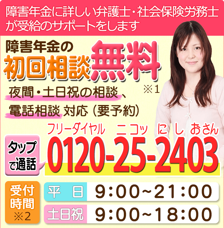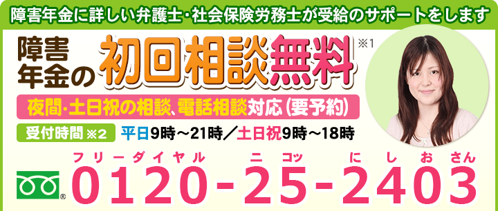 障害年金のご相談を希望される方は、こちらのフリーダイヤルもしくはメールフォームまでお気軽にお問い合わせください。