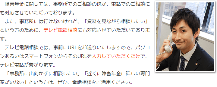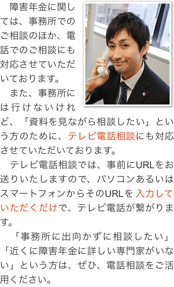 トップその他電話・テレビ電話相談について 階層構造▼ その他(目次) 電話・テレビ電話相談について その他(目次)その他トップ共通バナー※消さない障害年金無料診断サービス初めて障害年金を申請の方へ手続きの流れ代表メッセージ電話・テレビ電話相談について電話・テレビ電話相談の流れ心グループニュース(新着情報)お客様相談室費用の安さにこだわる理由関連リンクプライバシーポリシー 受付時間 平日 9時~21時、土日祝 9時~18時 夜間・土日祝の相談も対応します (要予約) 0120-25-2403 お問合せ・アクセス・地図