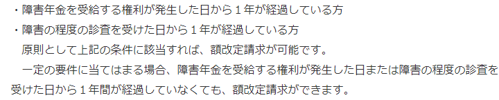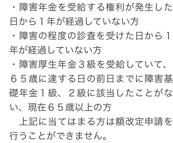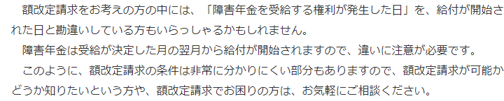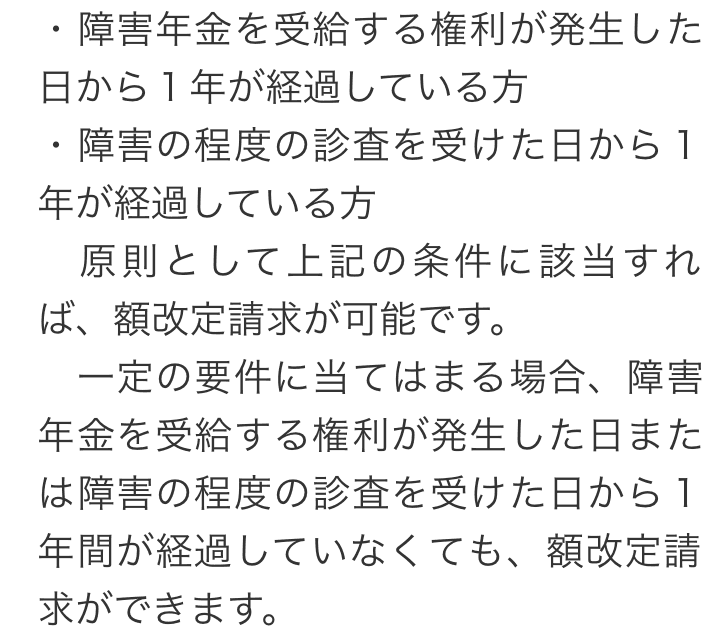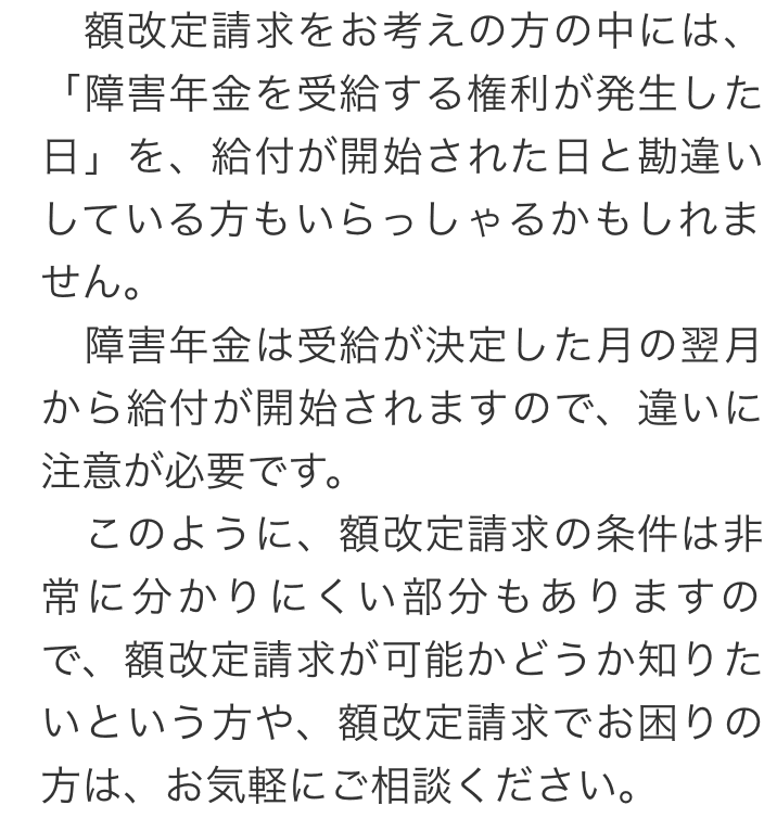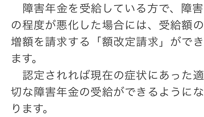 トップお役立ち情報額改定請求について 階層構造▼ お役立ち情報(目次) 額改定請求について1 額改定請求とは2 額改定請求ができるパターン3 額改定請求ができないパターン4 額改定請求に関してお困りの方へ 1 額改定請求とは2 額改定請求ができるパターン3 額改定請求ができないパターン4 額改定請求に関してお困りの方へ お役立ち情報(目次)お役立ち情報トップ障害年金を受給するためのポイント障害年金で必要な書類不支給通知が届いた場合働きながら障害年金を受給できる場合障害年金の種類障害年金の支給日精神疾患について障害年金が認められる基準額改定請求について障害者手帳について 受付時間 平日 9時~21時、土日祝 9時~18時 夜間・土日祝の相談も対応します (要予約) 0120-25-2403 お問合せ・アクセス・地図